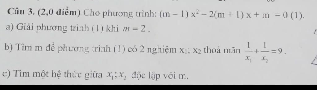 `{(x_1+x_2=[2(m+1)]/(m-1)),(x_1x_2=m/(m-1)):}` `(ĐKXĐ:m ne 1)`