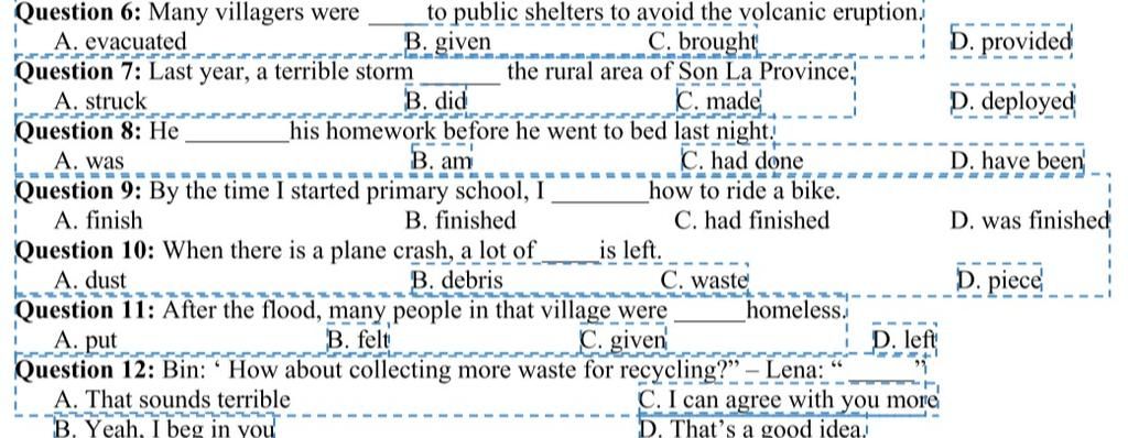 `-` A terrible storm struck the rural area: Một cơn bão khủng khiếp đã đổ bộ vùng nông thôn