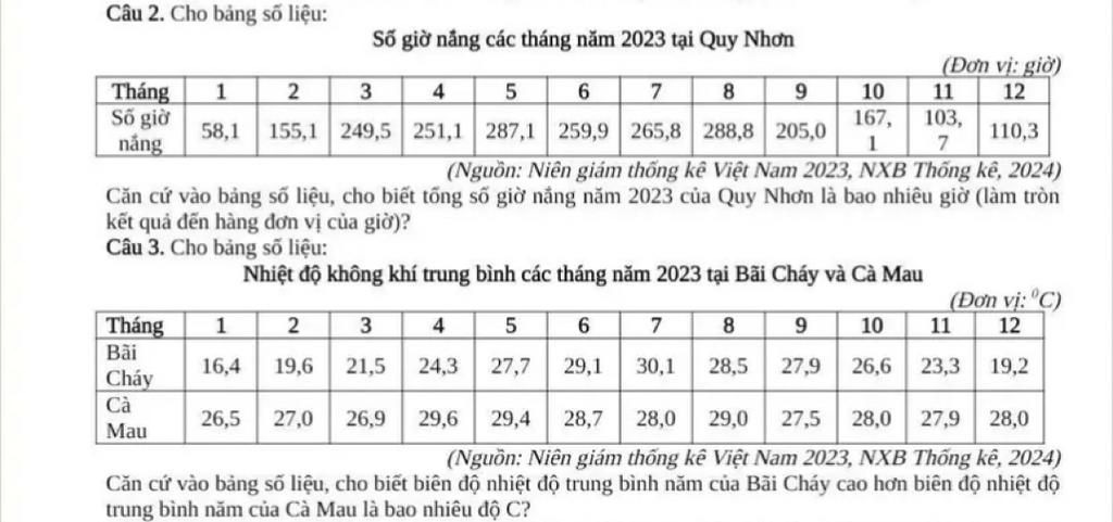 `color{red}{**text{Công thức:}`$\\$ `@` Tổng số giờ nắng năm`=` Tổng số giờ nắng của `12` tháng$\\$ `@` Biên độ nhiệt độ trung bình năm `=` Nhiệt độ tháng cao nhất `-` Nhiệt độ tháng thấp nhất $\\$Câu `bb2`:$\\$ Tổng số giờ nắng của Quy Nhơn năm `2023`:$\\$ $\rm58,1+155,1+249,5+251,1+287,1+259,9+265,8+288,8+205,0+167,1+103,7+110,3\approx2\,402(giờ)$$\\$ Câu `bb3`$\\$ `@` Bãi Cháy: $\\$ `+` Nhiệt độ cao nhất $\rm30,1^\circ C($tháng `7)`$\\$ `+` Nhiệt độ thấp nhất $\rm19,7^\circ C($tháng `1)`$\\$ `@` Cà Mau: $\\$ `+` Nhiệt độ cao nhất $\rm29,6^\circ C($tháng `4)`$\\$ `+` Nhiệt độ thấp nhất $\rm26,5^\circ C($tháng `1)`$\\$ $\\$Biên độ nhiệt độ trung bình năm của Bãi Cháy cao hơn Cà Mau:$\\$ $\rm(30,1-19,7)-(29,6-26,5)=7,3^\circ C$