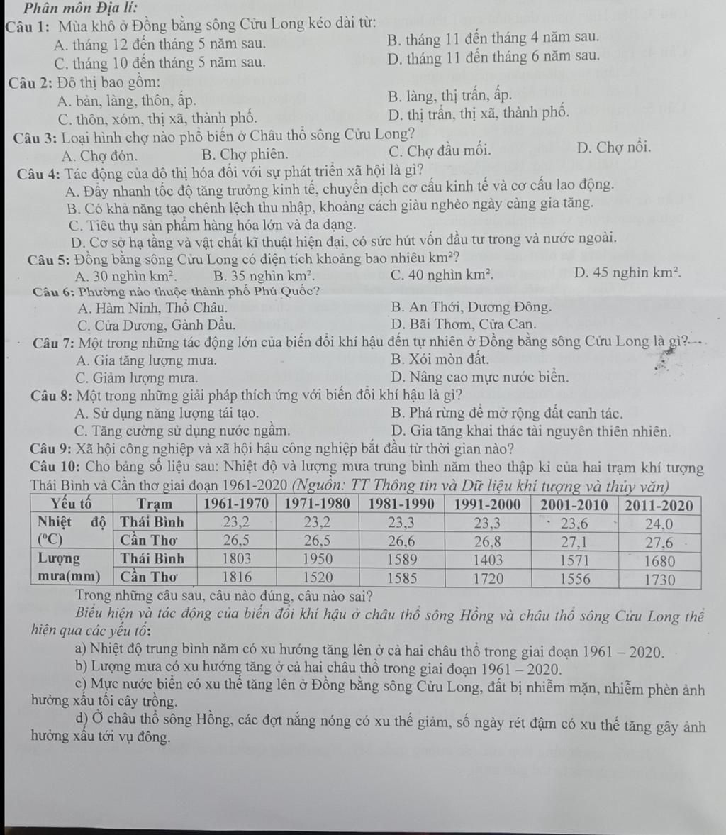 Câu 7: Tác động lớn của biến đổi khí hậu đến tự nhiên ĐBSCL: