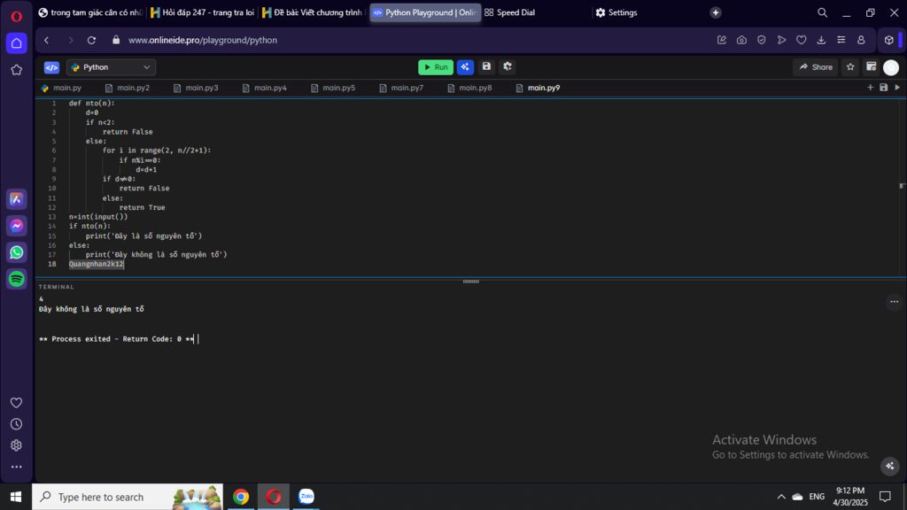 cái đoạn đếm thì ko cần đâu nếu chia hết cho return False luôn cho nhanh `->` do cái lúc đi học thêm cô cho bọn em học làm cái cách như vậy cho nên là em làm theo cách của cô ấy ạ, bởi vì em sợ làm theo cách của em nó sai ạ ._.