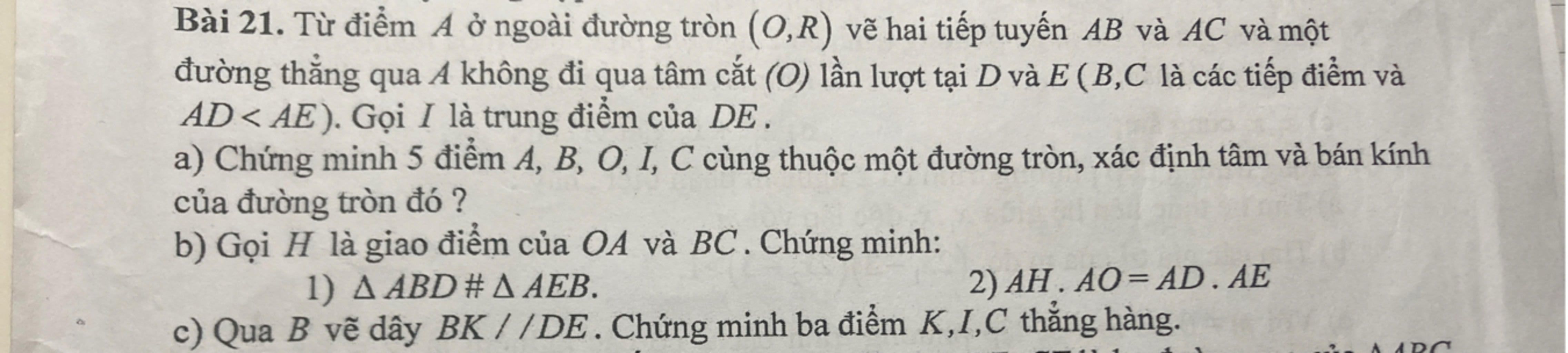 a.Vì $AB, AC$ là tiếp tuyến của $(O)$
