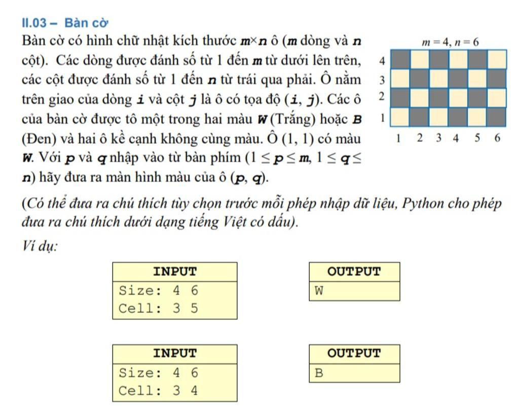 //Nhận thấy các ô có tổng chỉ số i và j là số chẵn thì có màu trắng, số lẻ thì có màu đen.