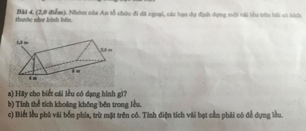 `a)` lều có dạng hình lăng trụ đứng tam giác