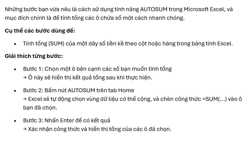 Bước 1: Chọn một ô bên cạnh các số bạn muốn tính tổng. Bước 2: Bấm nút AUTOSUM trên tab Home. Bước 3: Nhấn Enter để có kết quả.. Những cách đó dùng để làm gì ?