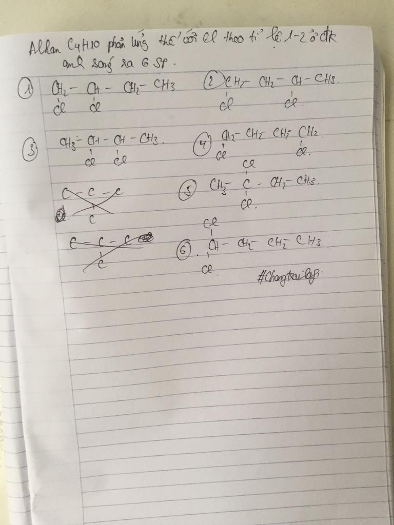`CH_3-CH_2-CH_2-CH_3+2Cl_2` $\xrightarrow{as}$ \(\left[ \begin{array}{l}CH_2Cl-CHCl-CH_2-CH_3\\CH_2Cl-CH_2-CHCl-CH_3\\CH_2Cl-CH_2-CH_2-CH_2Cl\\CH_3-CHCl-CHCl-CH_3\\CHCl_2-CH_2-CH_2-CH_3\\CH_3-CCl_2-CH_2-CH_3\end{array} \right.\)