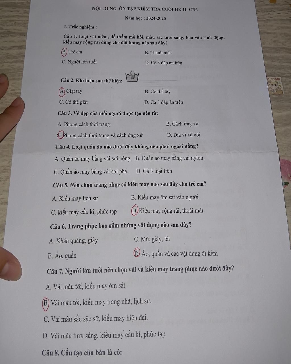`Câu 4.` Quần áo không nên phơi ngoài nắng là /C.quần áo vải sợi pha