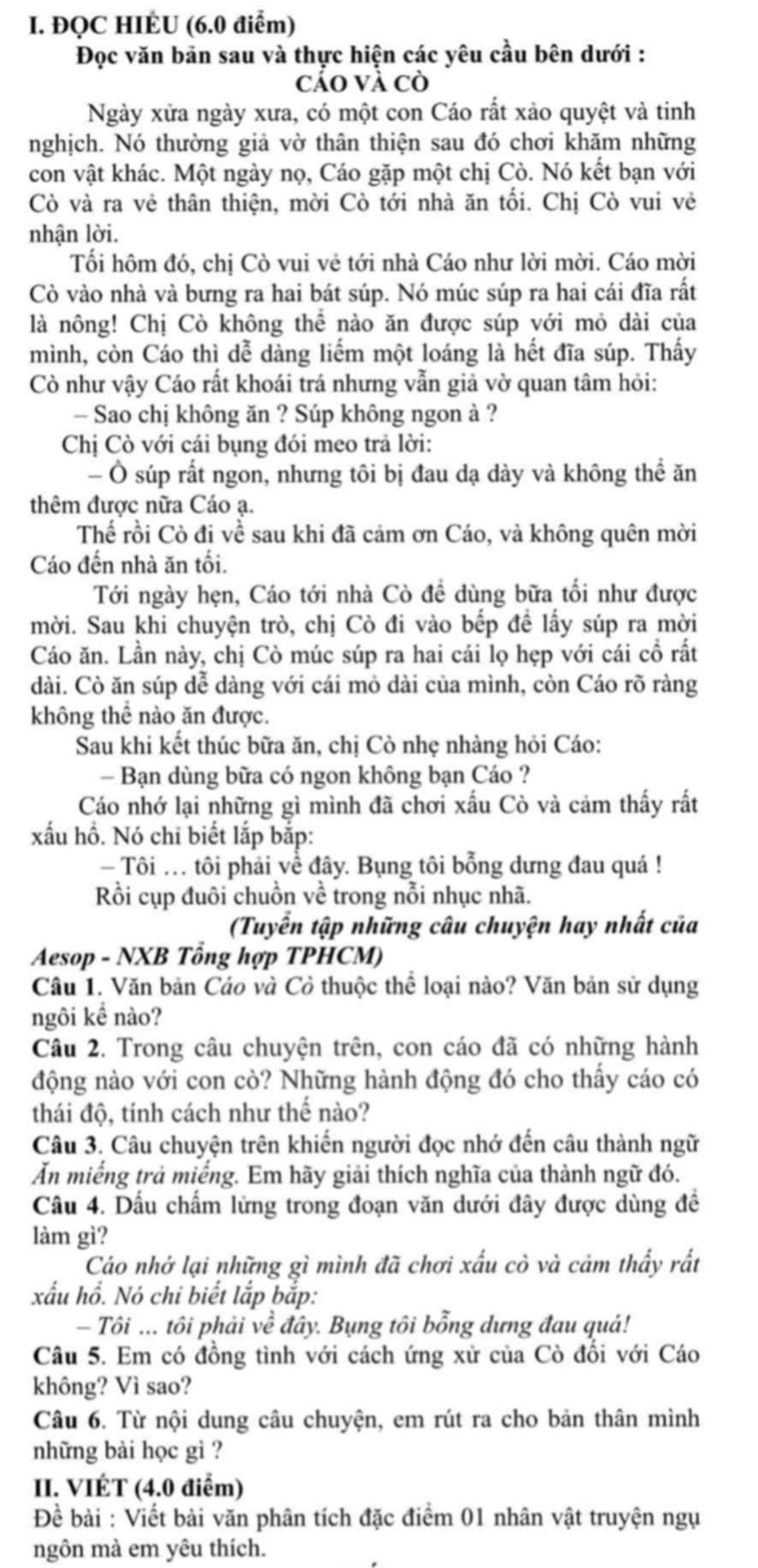 Câu 1: Văn bản Cáo Và Cò thuộc thể loại truyện ngụ ngôn, văn bản sử dụng ngôi kể thứ ba