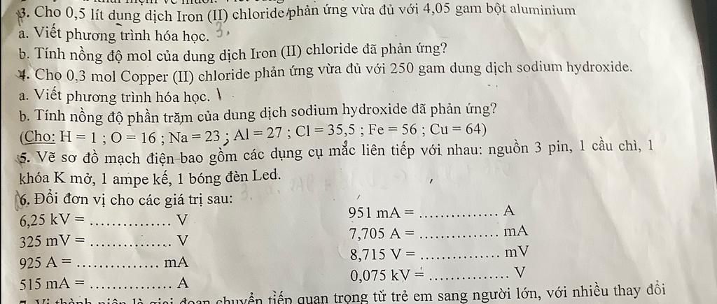 3. Cho 0,5 lít dung dịch Iron (II) chloride phản ứng vừa đủ với 4,05 gam bột aluminium