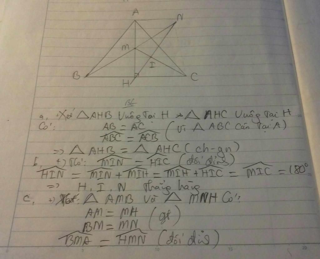 b) Gọi M là trung điểm của AH. Lấy điểm N thuộc tia đối của tia MB sao cho MB = MN. Trên cạnh CM lấy điểm I sao cho CI = `2/3`CM. Chứng minh ba điểm N, I, H thẳng hàng.