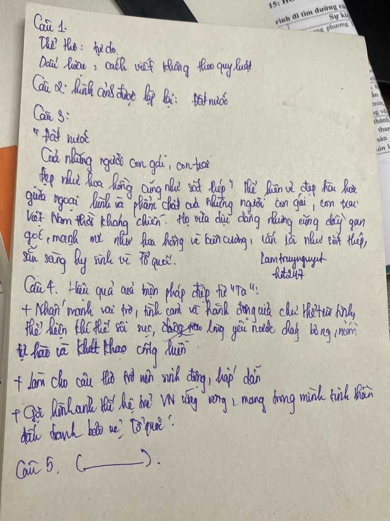 Câu 3. Nêu nội dung của những dòng thơ Đất Nước Của những người con gái con trat Đẹp như hoa hồng cứng như sắt thép Câu 4. Phân tích hiệu quả của biện pháp điệp từ trong đoạn thơ: Ta sung sướng được làm người con Đất Nước Ta băng tới trước quân thủ như triều như thác Ta làm bão, làm đông Ta lạy trời chuyển đất Câu 5. Từ cảm xúc Ta trút hơn căm để làm nên những vinh quang bất diệt của nhân vật trữ tình về đất nước trong đoạn trích, anh/chị hãy bày tỏ suy nghĩ của mình về người đối với đất nước trong thời kì hiện nay (trình bày trong khoảng 5-7 dông). trách nhiệm của mỗi H. VIỆT (6,0 điểm) Câu 1(2.0 điểm). Viết đoạn văn nghị luận (khoảng 200 chữ) phân tích những câu thơ sau: Đất Nước Của những người mẹ Mặc ảo thay vai Hạt lúa củ khoai Bền bị nuôi chồng, nuôi con chiến đầu