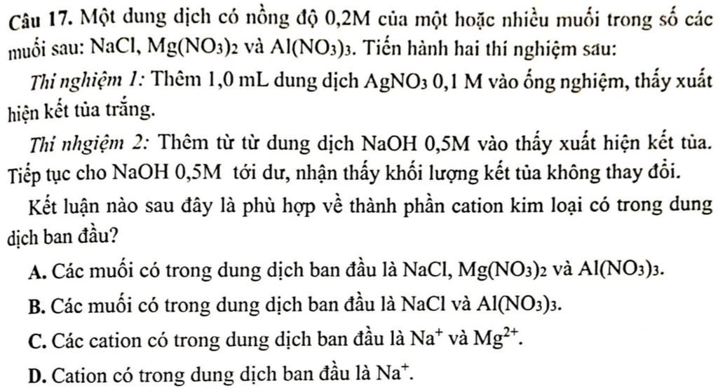 Do đó dung dịch ban đầu có `NaCl,Mg(NO_3)_2` chứa cation `Na^{+},Mg^{2+}`