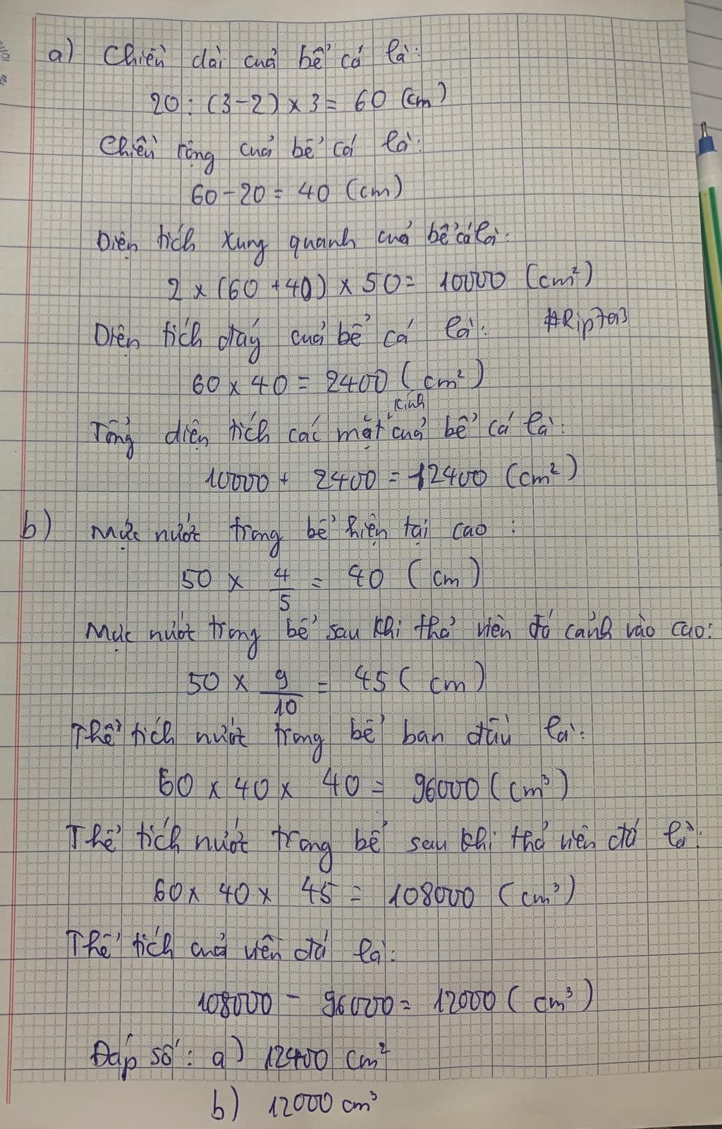 Một bể cá hình hộp chữ nhật có chiều cao 50 cm,chiều dài hơn chiều rộng 20 cm và bằng 3/2 chiều rộng.Bể cá đươc làm bằng kính và không có nắp. a)Tính tổng diện tích các mặt kính của bể cá b)Mực nước trong bể hiện tại bằng 4/5 chiều cao của bể.Người ta bỏ viên đá cảnh vào bể thì thấy mực nước lúc này bằng 9/10 chiều cao của bể.Tính thể tích viên đá cảnh đó.