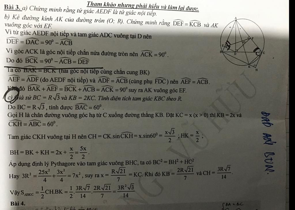 đề bài: Bài 3. Cho tam giác nhọn ABC (AB < AC) nội tiếp đường tròn (O; R). Kẻ đường cao AD của tam giá ABC. Gọi E, F theo thứ tự là chân đường vuông góc hạ từ D xuống các đường thẳng AB, AC.