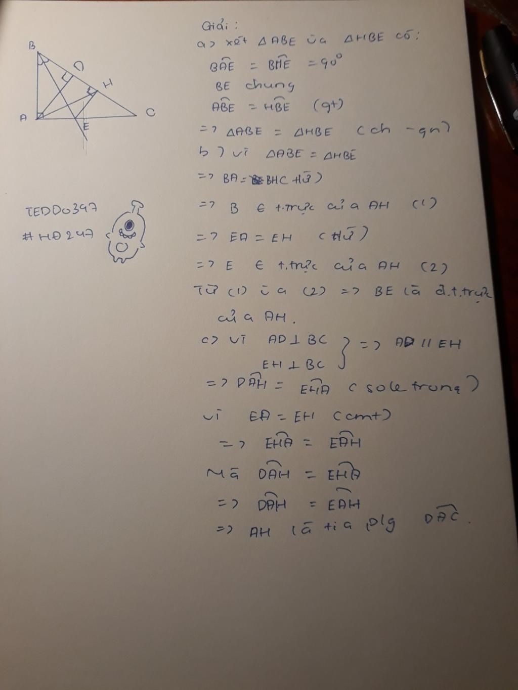 Cho tam giác ABC vuông tại A. Tia phân giác góc ABC cắt AC tại E. Từ E kẻ EH vuông góc với BC tại H. a/ CMR: tam giác ABE=tam giác HBE. b/ CMR: BE là đường trung trực của AH. c/ Kẻ AD vuông góc với BC ( D thuộc BC). CMR: AH là tia phân giác của góc DAC