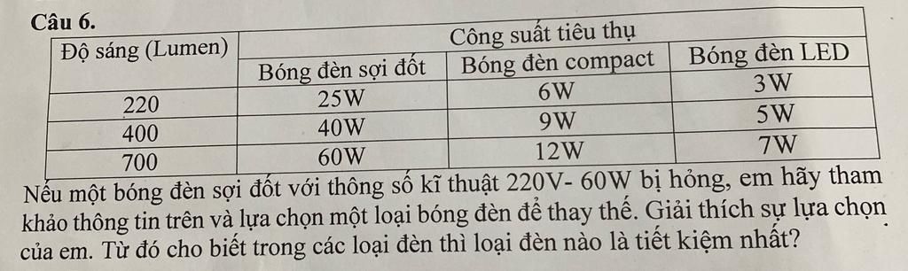 `*` nếu 1 bóng đèn sợi đốt 60W bị hỏng , em sẽ :