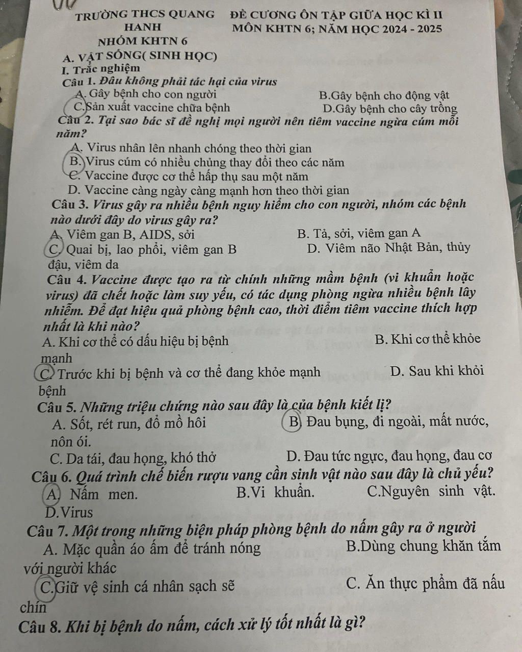 Câu `2: B` - Virus cúm có nhiều chủng thay đổi theo các năm (SBT KHTN `6` - KNTT )