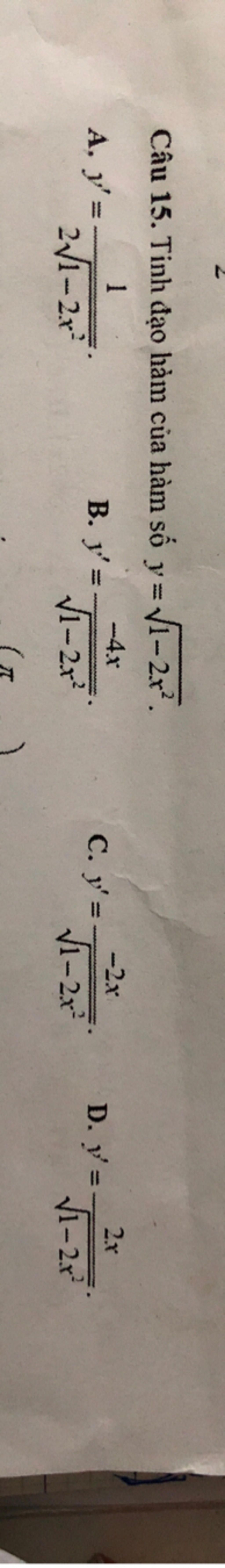 `y = \sqrt{1-2x^2}``y' = ((1-2x^2)')/(2\sqrt{1-2x^2})``= (-4x)/(2\sqrt{1-2x^2})``= (-2x)/(\sqrt{1-2x^2})``-> bbC`