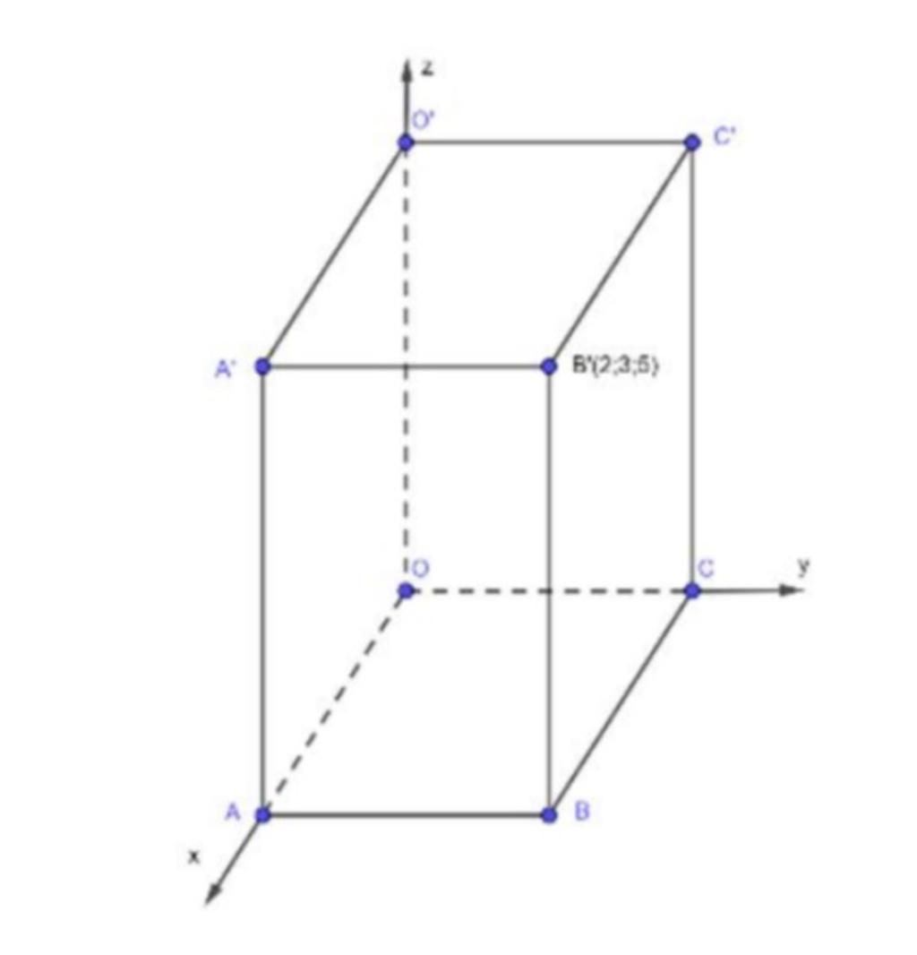 Trong không gian Oxyz cho hình hộp chữ nhật OABC.O'A'B'C'. Tọa độ của điểm B'(2;3;5). Tìm toạ độ điểm O'