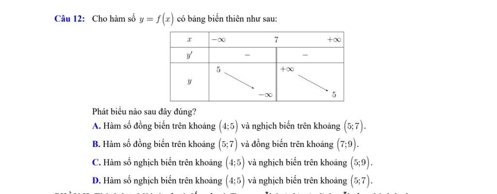Hàm số nghịch biến trên `(5;9)` sai vì hàm số không liên tục tại `x=7` mà phải là hàm số nghịch biến trên `(5;7)` và `(7;9)`