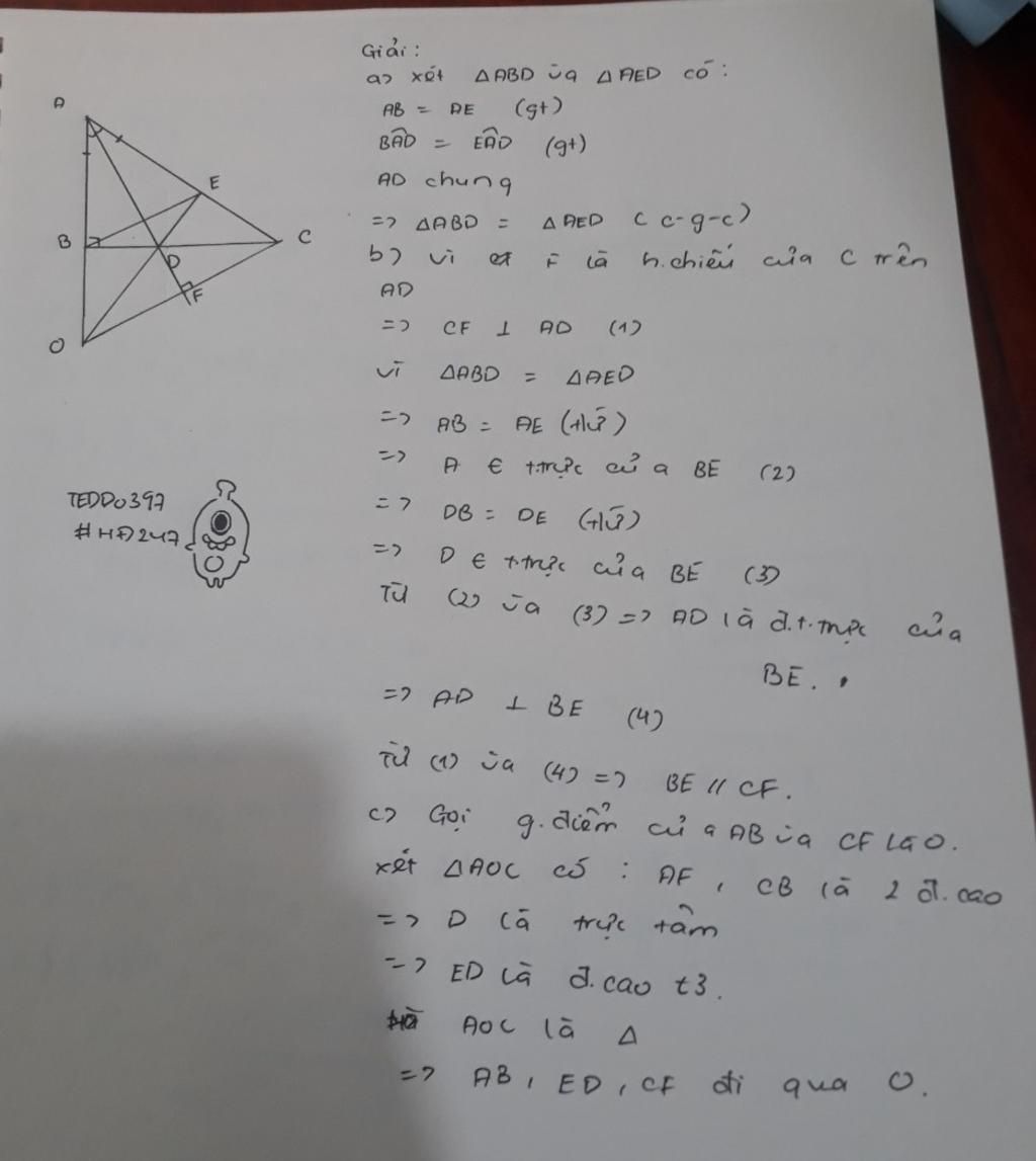 Xét t/g ABD và t/g AED có: chung cạnh AD ; AB=AE (gt) ; ∠BAD=∠EAD ( 2 góc phân giác ở A)