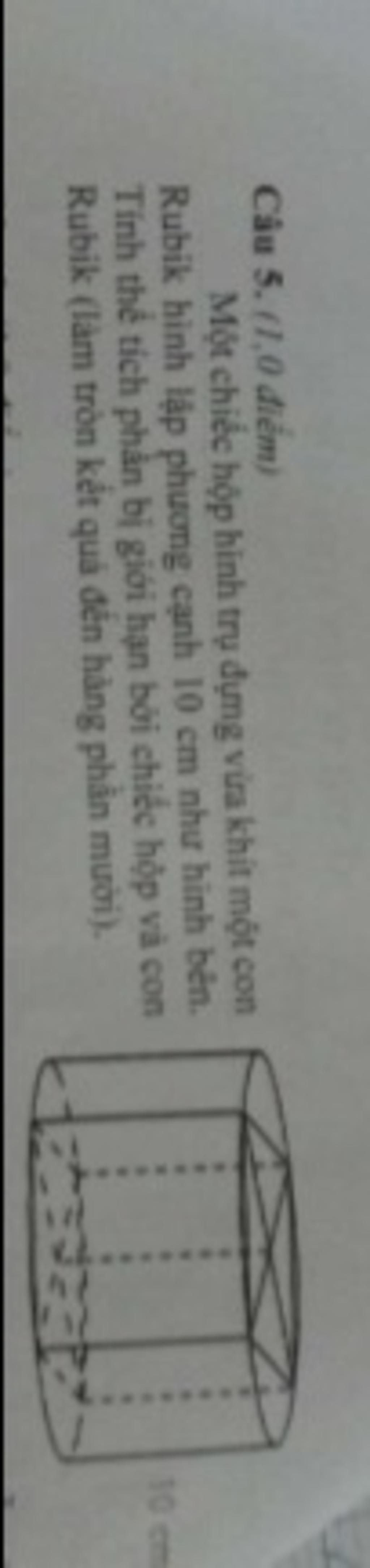 Vì hộp hình trụ đặt vừa khít con rubik hình lập phương cạnh `10cm` nên mặt đáy của hình trụ ngoại tiếp hình vuông cạnh `10cm` và chiều cao `h = 10cm`