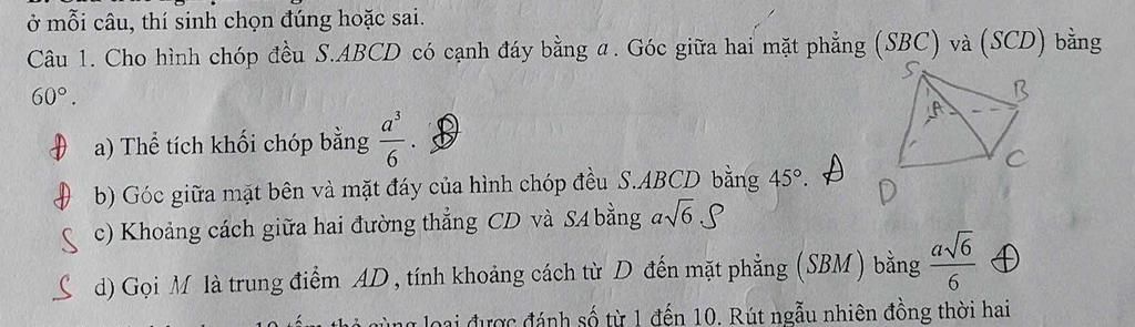 Đ b) Góc giữa mặt bên và mặt đáy của hình chóp đều S.ABCD bằng 45°.