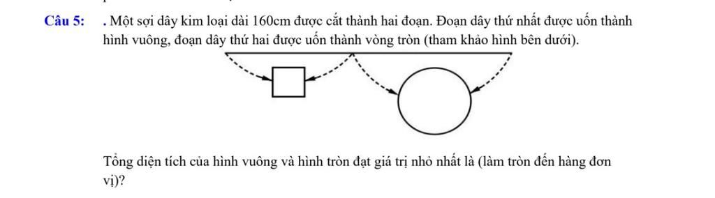 Gọi độ dài đoạn dây làm hình tròn là `x(cm) ( 0<x< 160)`