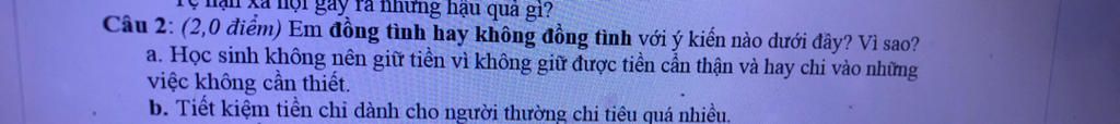 a,Không đồng tình .Việc học quản lí tiền là kĩ năng quan trọng cần thiết cho mọi học sinh .Thay vì cấm , nên hướng dẫn các em chi tiêu tiền hơp lí