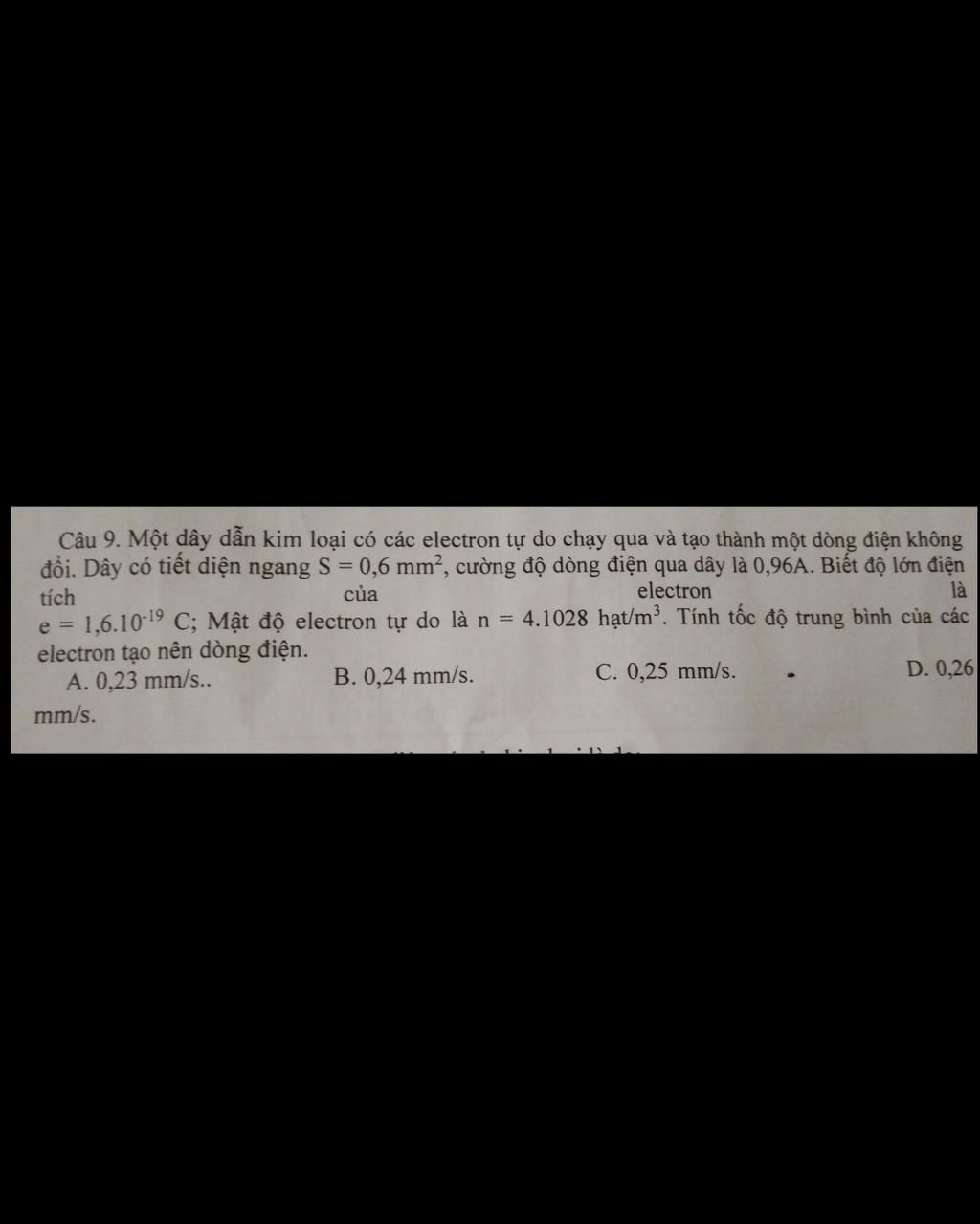 \(v = \dfrac{i}{{nq}} = \dfrac{I}{{nqS}} = \dfrac{{0,96}}{{{{4.10}^{28}}.1,{{6.10}^{ - 19}}.0,{{6.10}^{ - 6}}}} = 2,{5.10^{ - 4}}\left( {m/s} \right)\)