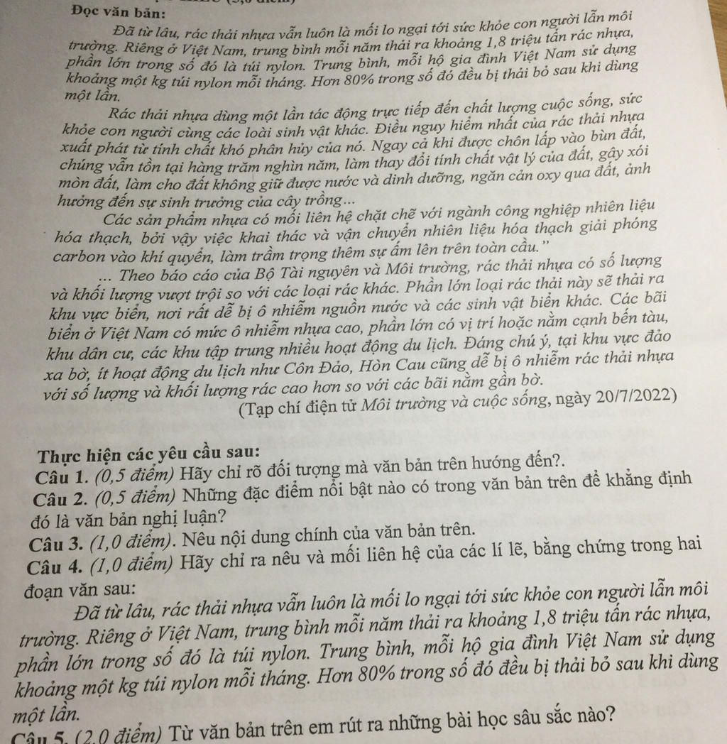 `+)` Luận cứ: Riêng ở Việt Nam, trung bình mỗi năm thải ra khoảng 1,8 triệu tấn rác nhựa, phần lớn trong số đó là túi nylon.... Hơn 80% trong số đó đều bị thải bỏ sau khi dùng một lần.