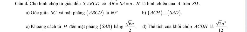 `=> d(H,(SAB))= d(O,(SAB)) = (a sqrt6)/6`