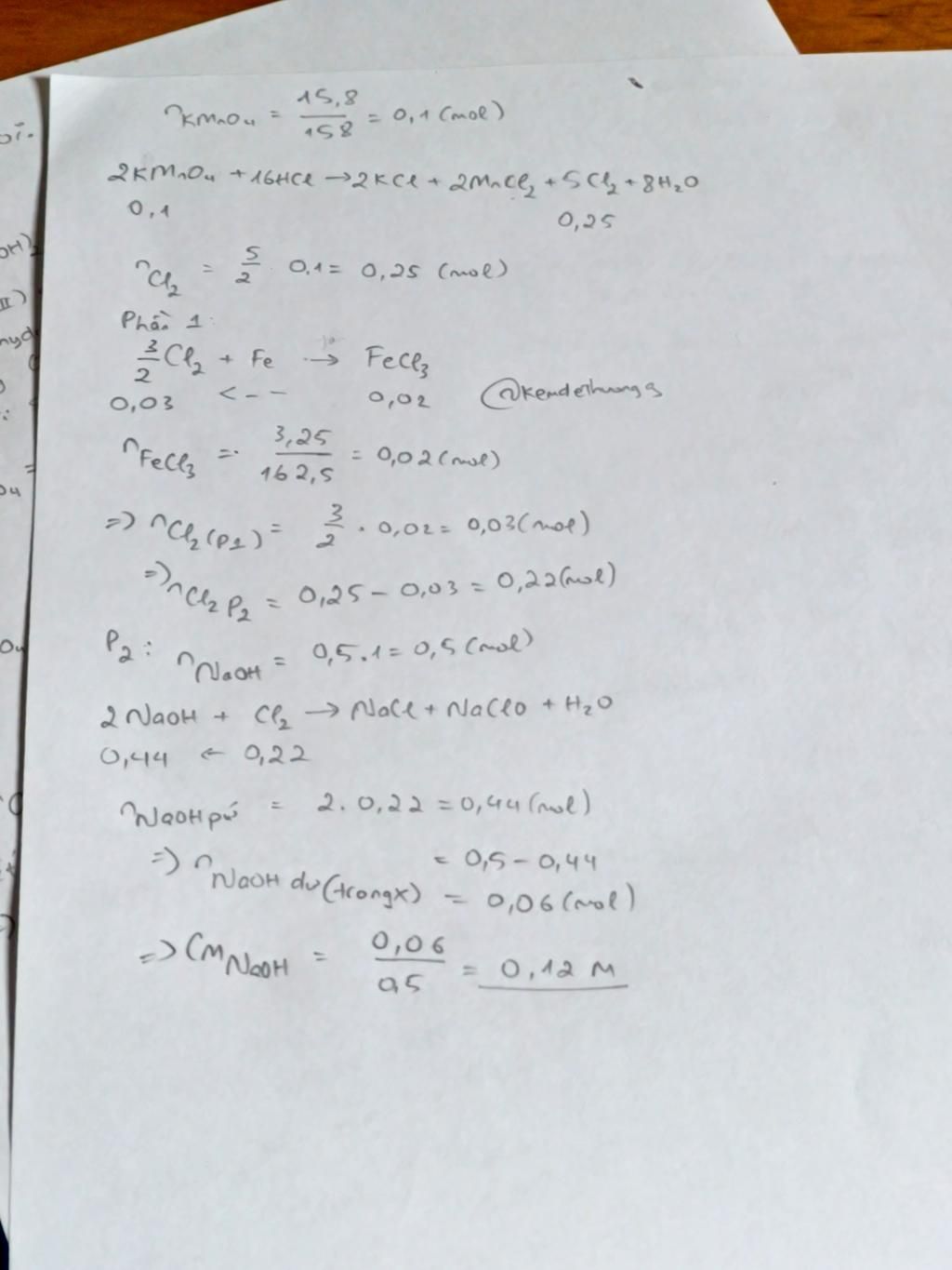 Cho 15,8 gam KMnO4 tác dụng với dung dịch HCl đặc dư, thu được khí Cl2. Chia lượng khí này làm 2 phần. Cho phần 1 tác dung với Fe được 3,25 gam muối. Cho phần 2 tác dụng với 500 ml dung dịch NaOH 1M thu được dung dịch X. Giả sử thể tích dung dịch không đổi. Nồng độ NaOH có trong dung dịch X là?