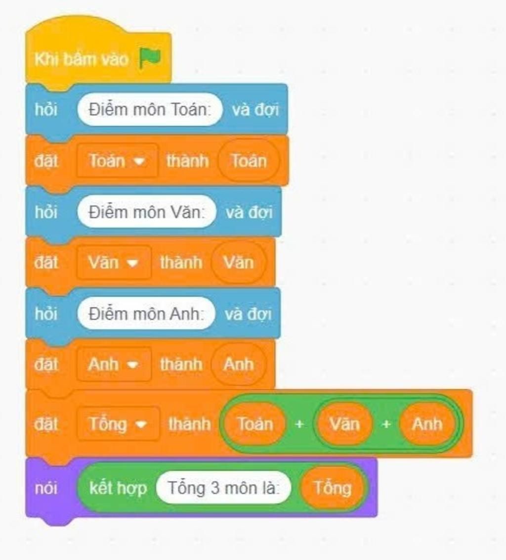 Một học sinh muốn viết chương trình trong Scratch để tính tổng điểm của ba môn khảo sát toán văn anh. Bạn ấy nhập điểm cho từng môn, sau đó chương trình sẽ tính tổng điểm và thông báo kết quả. Tuy nhiên, khi chạy thử chương trình, các biến đều không nhận được giá trị nhập vào và không tính được tổng. Chương trình của bạn như trên.
