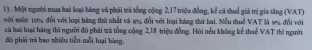 Một người mua hai loại hàng phải trả tổng cộng `2,18` triệu đồng nếu tính thuế VAT cho món hàng thứ nhất và thứ hai là `9%`. Ta có phương trình: