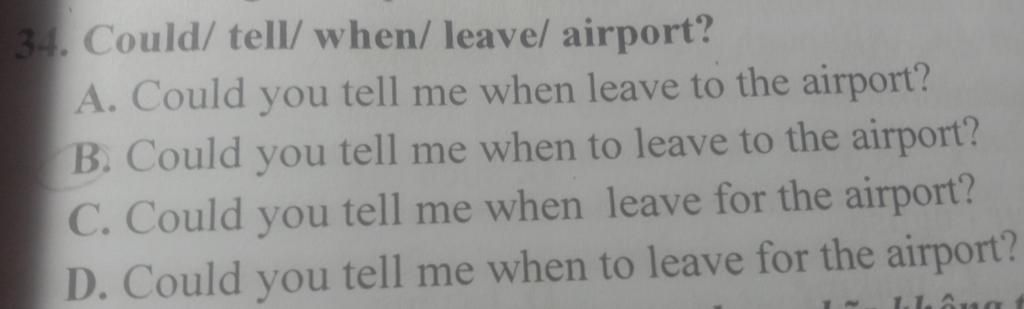 Đáp án : D . Could you tell me when to leave for the airpot ?