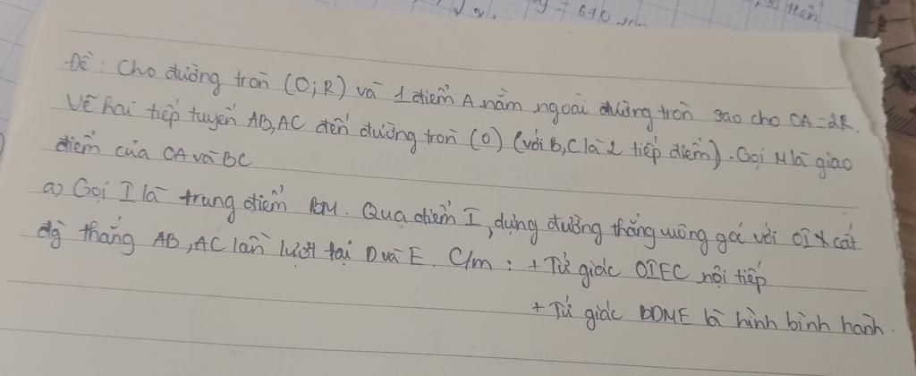 Đề: Cho đường tròn (O;R) và 1 điểm A nằm ngoài đường trên sao cho Chích,