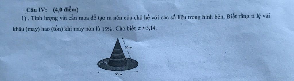 Diện tích của cái nón là : Sn = 225$\pi$ + 250$\pi$ = 475$\pi$ (cm²)