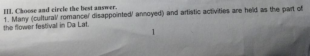 1. Many (cultural/ romance/ disappointed/ annoyed) and artistic activities are held as the part of