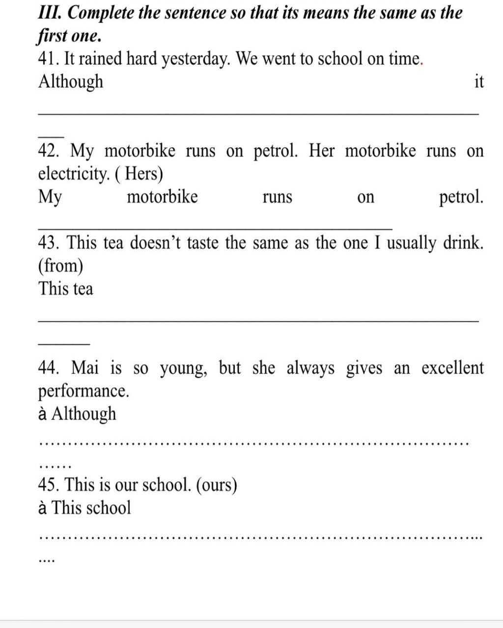 `42.` My motorbike runs on petrol. Hers runs on electricity.