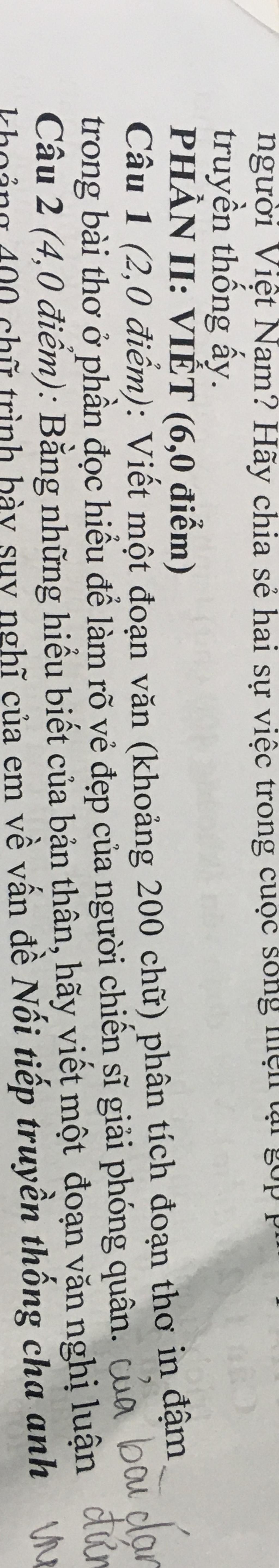 Câu 1 (2,0 điểm): Viết một đoạn văn (khoảng 200 chữ) phân tích đoạn thơ in đậm