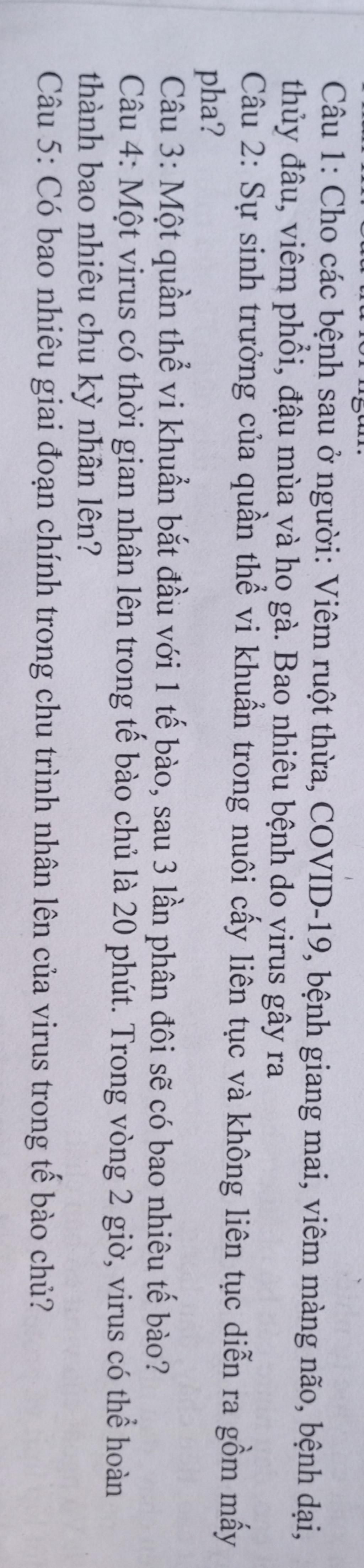 Cho các bệnh sau ở người: viêm ruột thừa, covid 19, bệnh giang mai, viêm màng não, bệnh dại, thủy đậu viêm phổi ,đậu mùa, ho gà. Bao nhiêu bệnh do virus gây ra?
