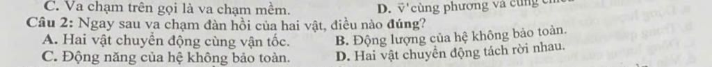 A. Chuyển động cùng vận tốc là va chạm mềm ⇒ Loại