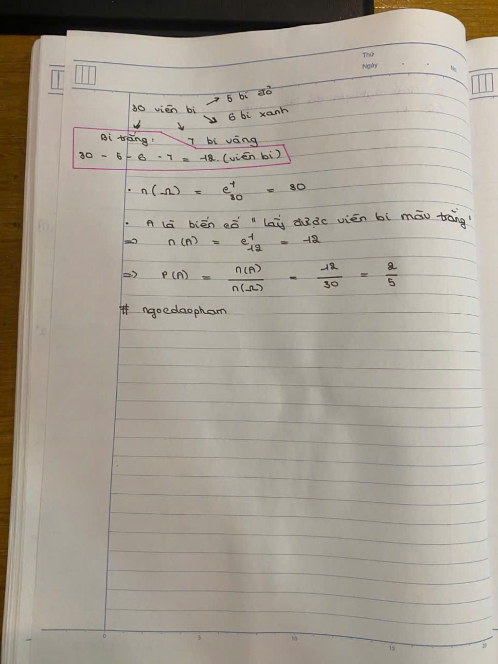 Số viên bi màu trắng : 30-5-6-7= 12 viên