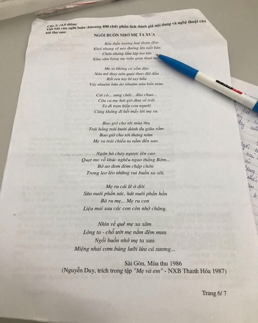 Cuối cùng Nguyễn Duy lại quay lại với nỗi nhớ mẹ, nhớ quê tha thiết, nhớ về những đêm đông giá rét, những ngày mưa gió mái tranh chẳng đủ che mưa, mà thương con mẹ nhường chỗ ấm, chịu nằm chỗ ướt, chập chờn trong giấc ngủ mơ màng "ngồi buồn nhớ mẹ ta xưa/miệng nhai cơm búng lưỡi lừa cá xương...".
