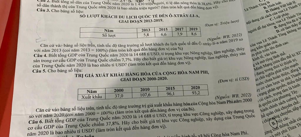 Câu `bb3`:$\\$ Tốc độ tăng trưởng số lượt khách du lịch quốc tế của Ô`-`xtrây`-`li`-`a năm `2019` so với năm `2013`:$\\$ $\dfrac{8,6}{5,8}\times100\approx148(\%)$$\\$ Câu `bb4`:$\\$ Giá trị khu vực nông nghiệp, lâm nghiệp, thuỷ sản của Trung Quốc năm `2020`:$\\$ $\dfrac{14\,688\times7,7}{100}\approx1\,131($tỉ USD`)`$\\$ Câu `bb5`:$\\$ Tốc độ tăng trưởng giá trị xuất khẩu hàng hoá của Cộng hoà Nam Phi năm `2000` so với năm `2020`:$\\$ $\dfrac{93,2}{47,0}\times100\approx252(\%)$ $\\$Câu `bb6`:$\\$ Giá trị khu vực công nghiệp, xây dựng của Trung Quốc năm `2020`:$\\$$\dfrac{14\,688\times37,8}{100}\approx5\,552($tỉ USD`)`