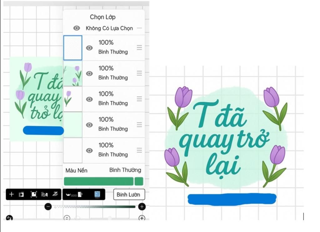 `-` Nếu nhìn, hẳn sẽ tương ứng với bông hoa ở góc trái phía trên (1), nhưng sao lá bên trái trong layer thì ngắn hơn, mà lên tranh thì lại nhỏ hơn?
