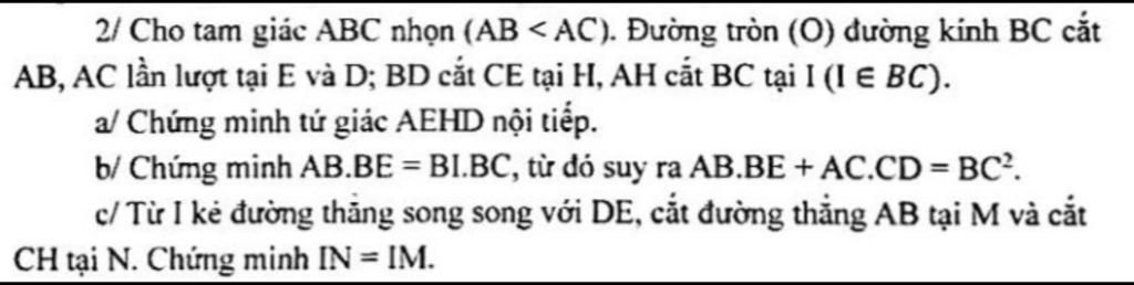 b.Vì $BD\cap CE=H\to H$ là trực tâm $\Delta ABC\to AH\perp BC=I$