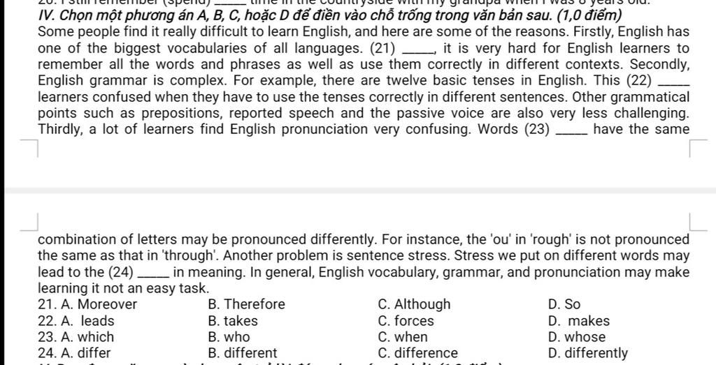 IV. Chọn một phương án A, B, C, hoặc D để điền vào chỗ trống trong văn bản sau. (1,0 điểm)