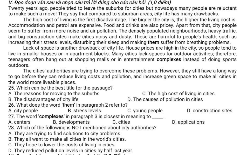 `-` Hầu hết đoạn văn nói về những bất lợi của cuộc sống ở thành phố:
